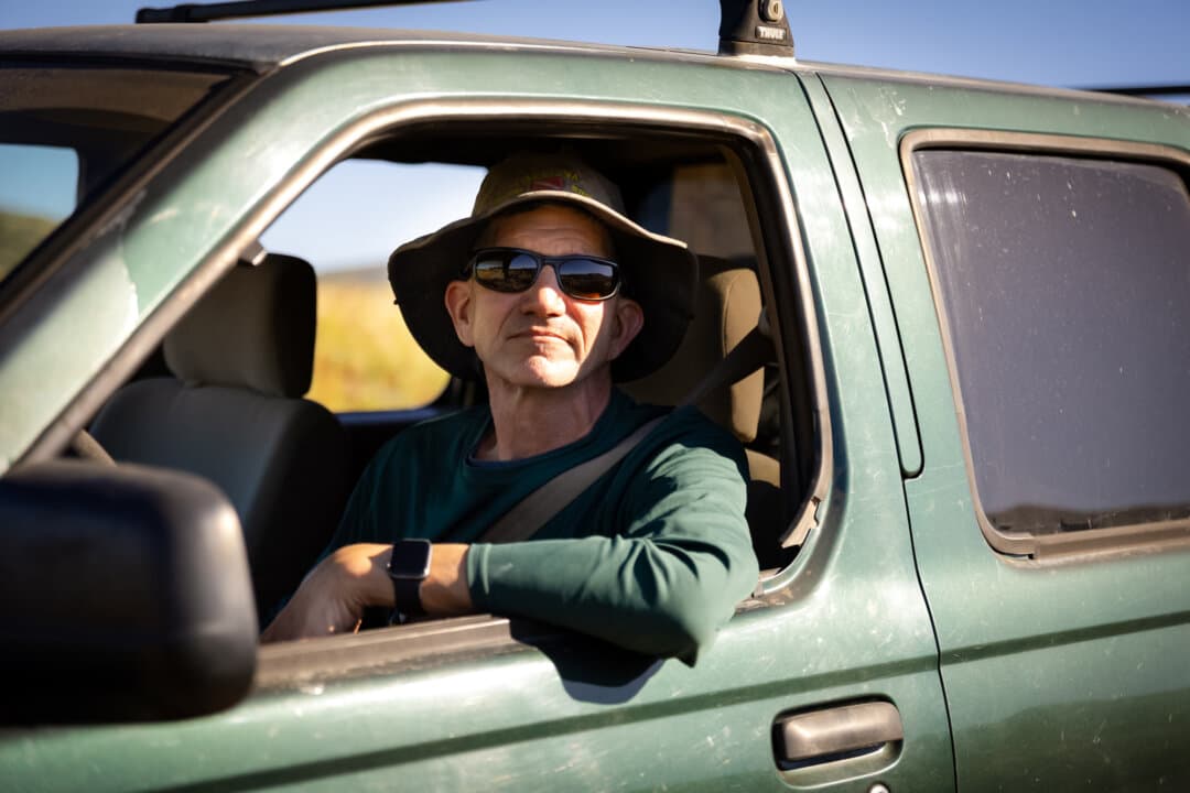 (Top) William Flickinger drives along a dirt road outside Avalon, Calif., on March 18, 2026. A hunter and Catalina Island resident for 38 years, Flickinger opposes the conservancy’s eradication plan, saying it would end hunting, eliminate a source of “clean” venison, and limit opportunities to teach younger people how to hunt. (Bottom) A hunter holds a deer bone outside of Avalon, Calif., on March 18, 2026. (John Fredricks/The Epoch Times)