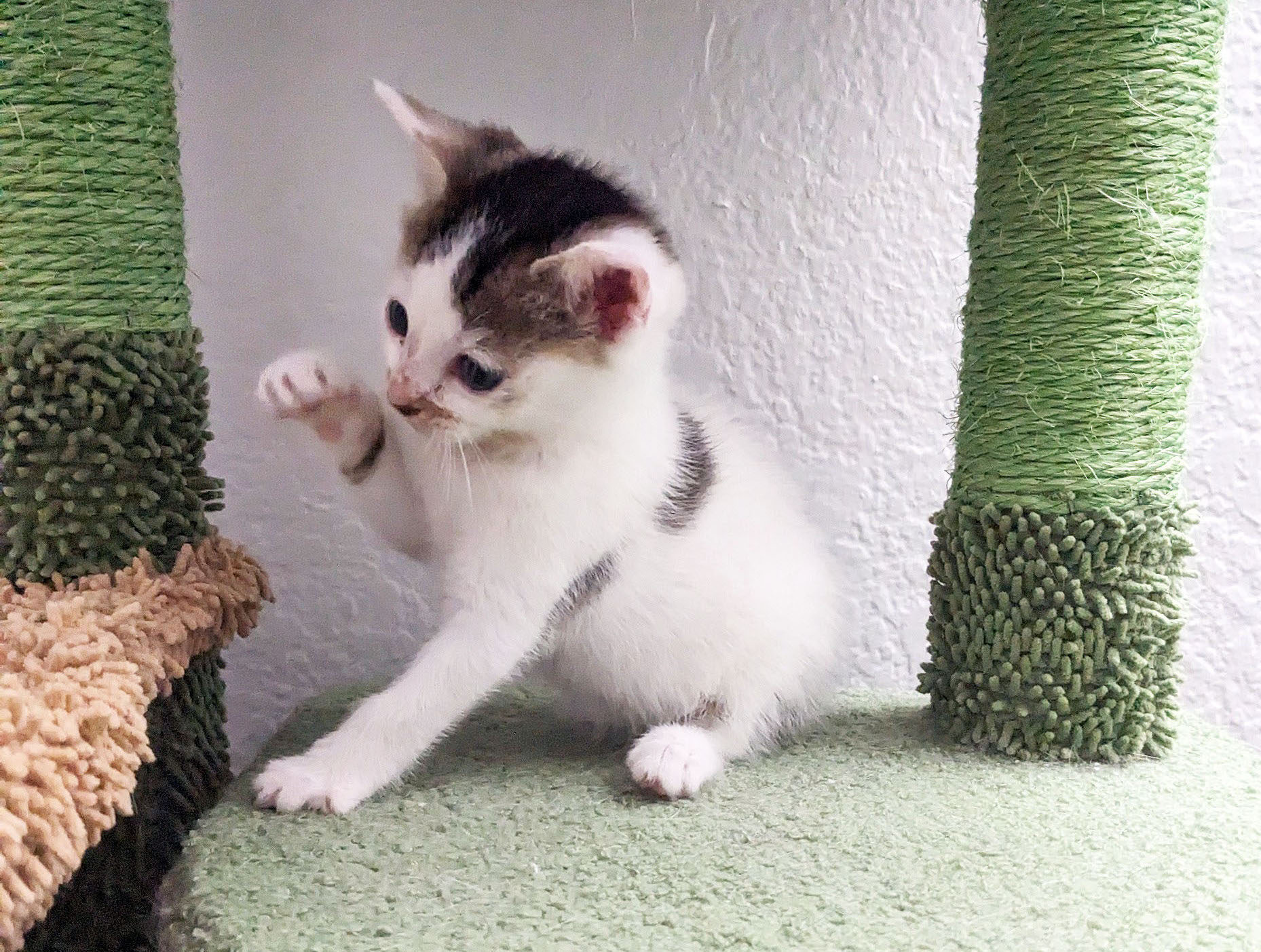 The kitten was described as a 1-pound, mostly white tabby with three gray dots on its coat.