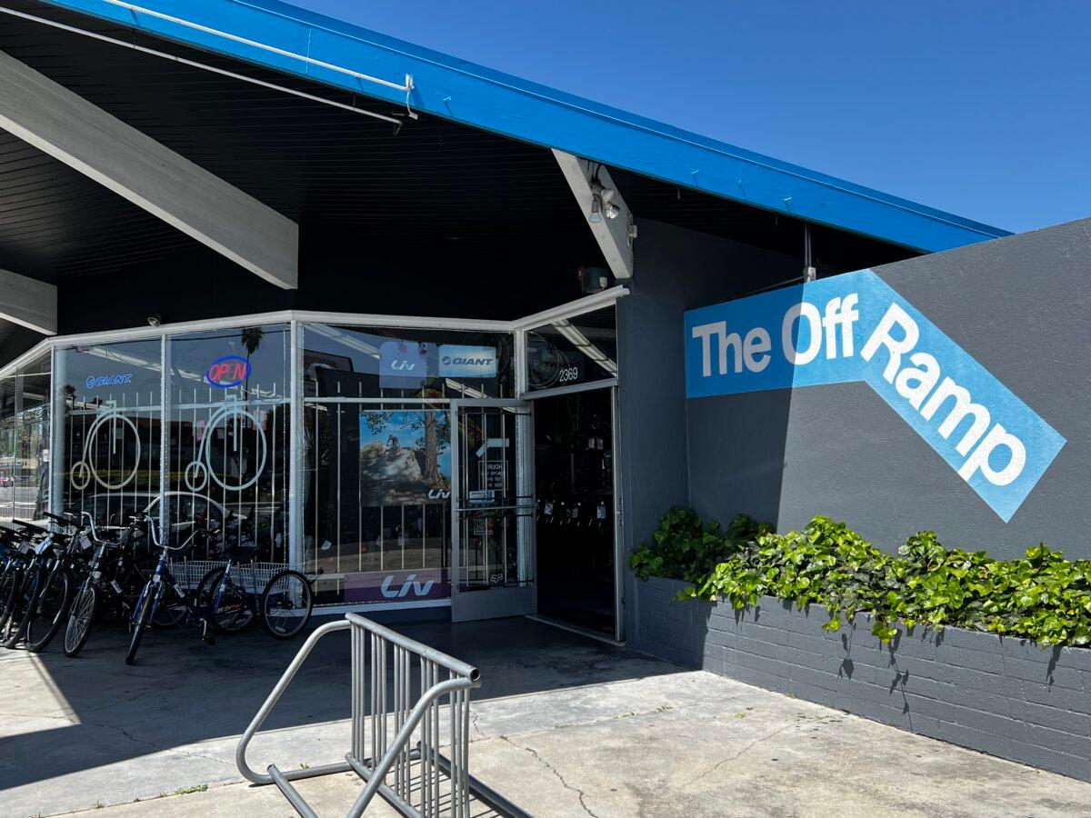 The exterior of The Off Ramp bike shop in Santa Clara, Calif., on April 12, 2025. (Conner Lee/The Epoch Times)