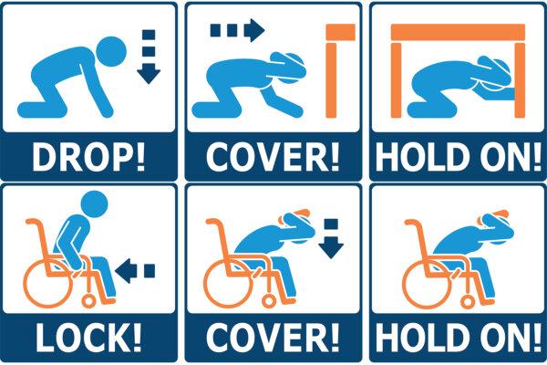 Illustrations of the three actions of drop/lock, cover, and hold on that help people protect themselves during earthquakes. (Courtesy of Earthquake Country Alliance)