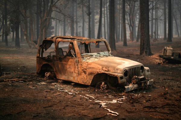 A vehicle and surrounding forest are burned after the Bridge Fire swept through on Sept. 11, 2024, in Wrightwood, Calif. (Eric Thayer/AP Photo)