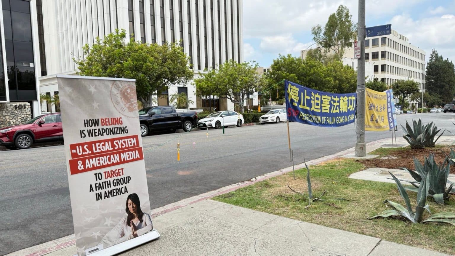 Falun Gong practitioners’ banners outside the Chinese Consulate in Los Angeles. (Courtesy of Falun Dafa Information Center)