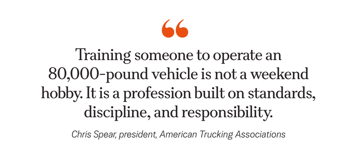 “Training someone to operate an 80,000-pound vehicle is not a weekend hobby,” ATA President and CEO Chris Spear said in a Dec. 1 statement. “It is a profession built on standards, discipline, and responsibility.