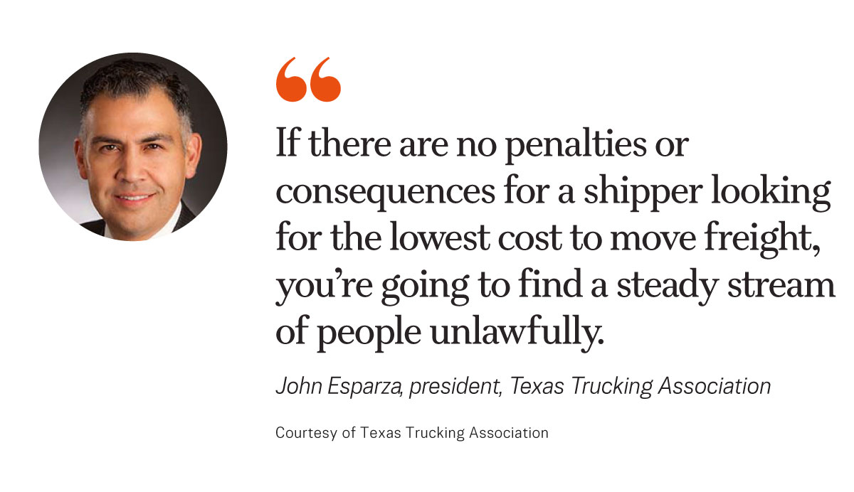 “If there are no penalties or consequences for a shipper looking for the lowest cost to move freight, you’re going to find a steady stream of people unlawfully,” Esparza said.