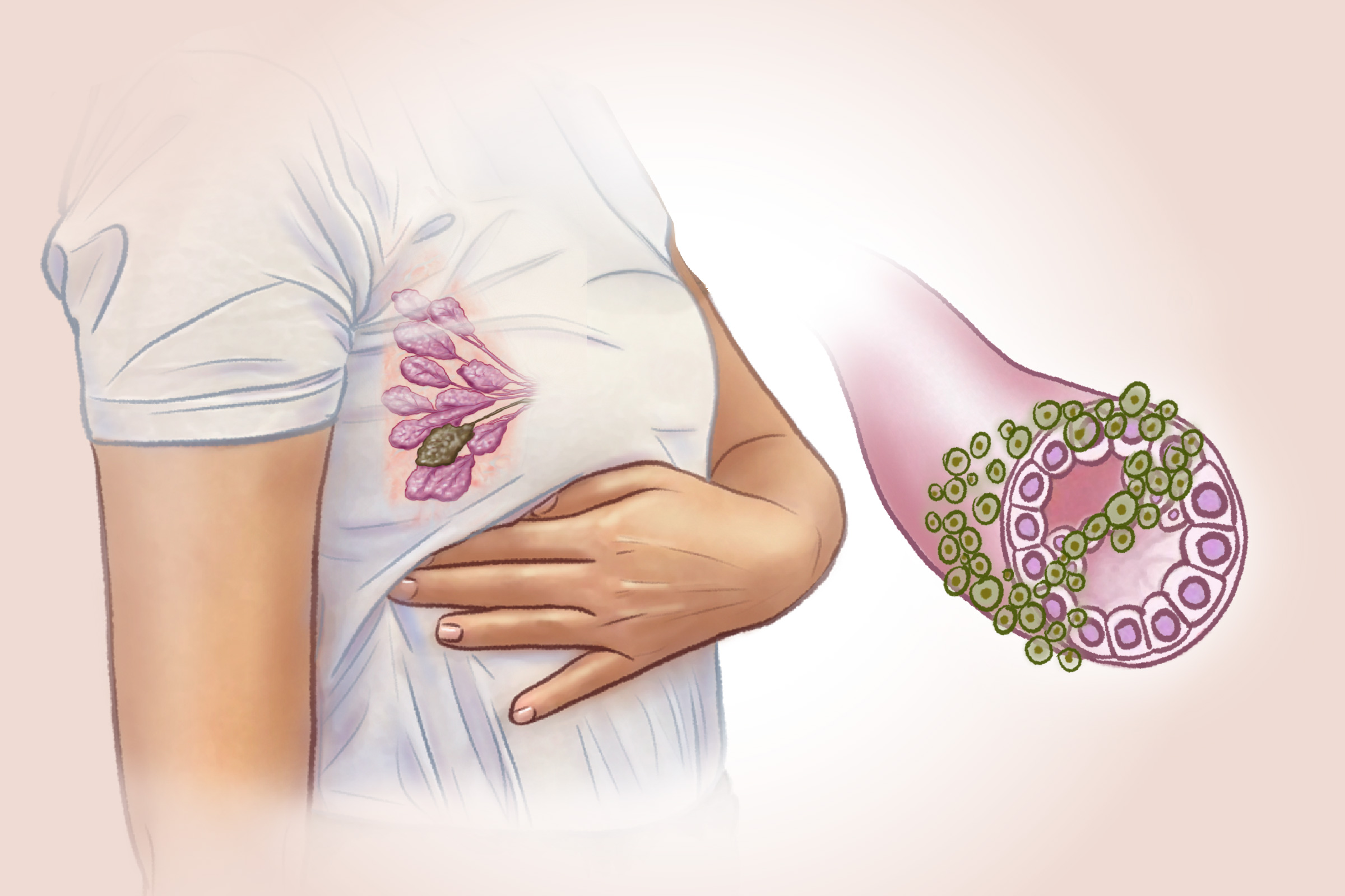 - Swollen lymph nodes in the armpit near the affected breast