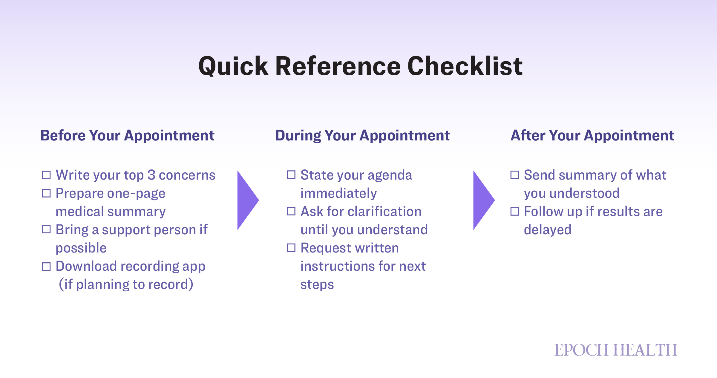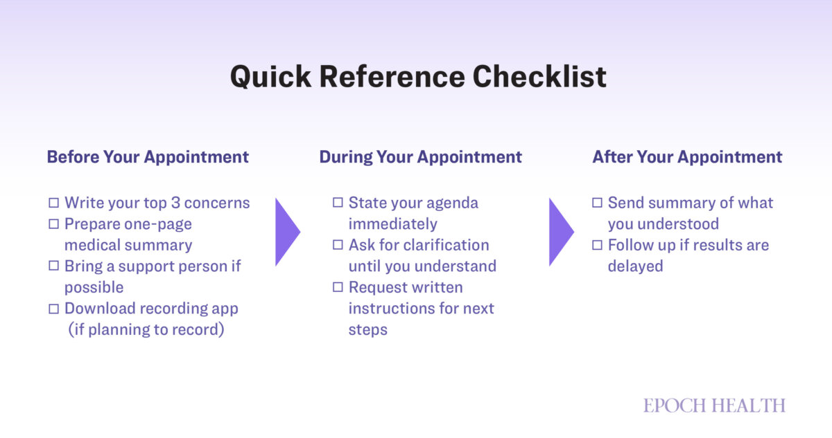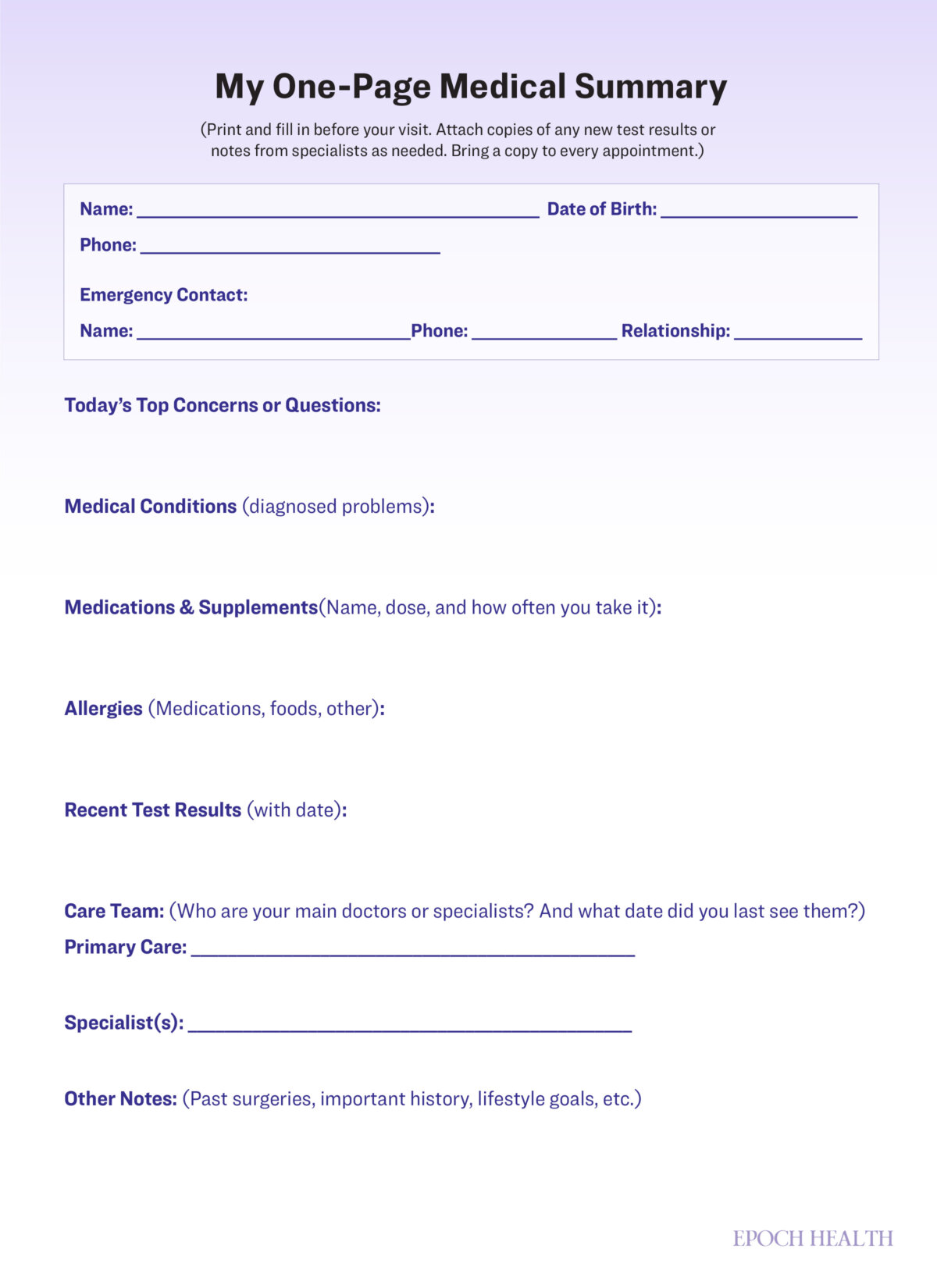 The best tool is a one-page summary that includes your main concerns, new symptoms, allergies, a medication list —including supplements—and recent test results. Add a brief directory of your care team if needed. Leave the stacks of paperwork at home.