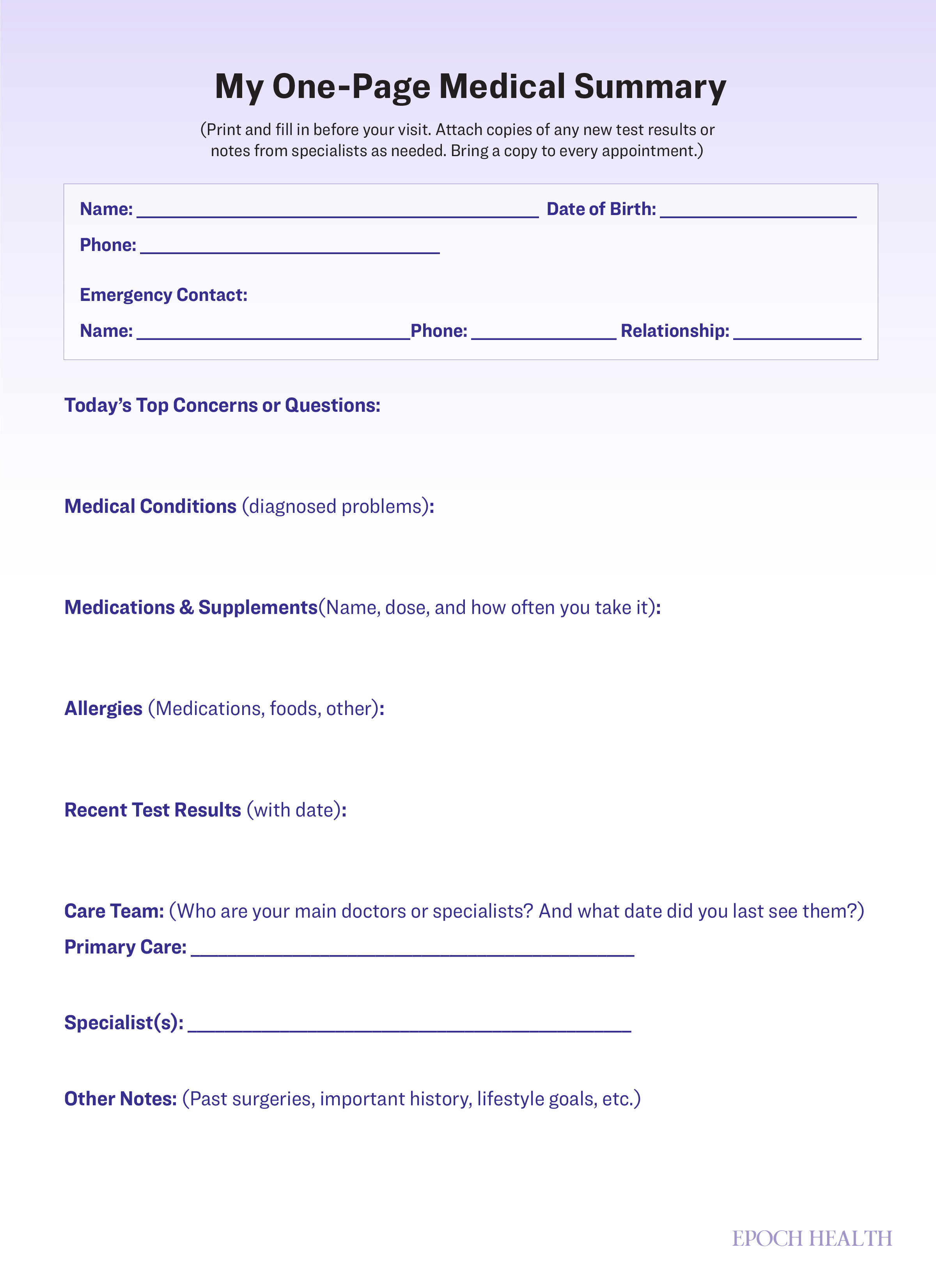 “Doctors appreciate when patients are engaged and prepared,” Dr. Dorothy Serna, an internal medicine physician, told The Epoch Times. “They remember the people who bring a list of concerns and want to understand their options.”