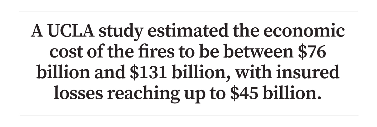 A UCLA study estimated the economic cost of the fires to be between $76 billion and $131 billion, with insured losses reaching up to $45 billion.