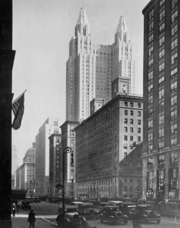 The Waldorf Astoria Towers in the distance over the other buildings on Park Avenue in New York City in the 1930s. (Lass/Archive Photos/Getty Images)