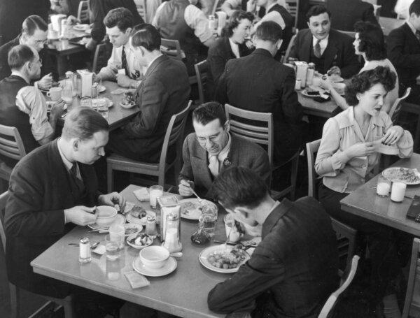 Ford workers eating in the Willow Run bomber plant cafeteria during their lunch period, circa 1950s. (FPG/Getty Images)