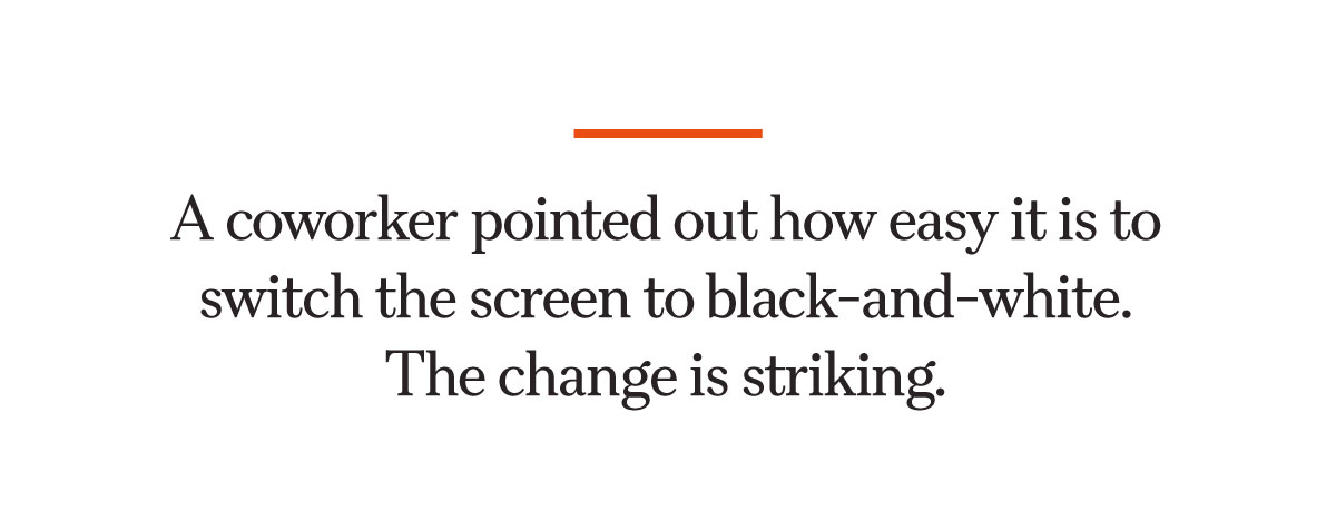 I’m toying with the color scheme. A coworker pointed out how easy it is to switch the screen to black-and-white. The change is striking. Red notifications don’t scream for attention. App logos are less inviting, and videos are less engaging. I may or may not keep it this way.