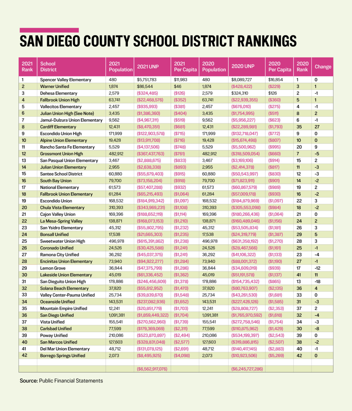 Solana Beach had revenues in excess of expenditures of $6.6 million and drew down $21.9 million from restricted assets. It allocated $3.9 million towards net investment in capital assets and had prior period adjustments of $0.07 million, resulting from GASB 84 for fiduciary activities. This Government Accounting Standards Board industry promulgation became effective for fiscal years ending after Dec. 15, 2019. Together it should have reduced its unrestricted net deficit by $25.1 million, but there is a missing $0.57 million. Do a search of the word “adjustment” and you receive 34 hits. Those residing in this district may want a presentation on the difference from its Chief Business Officer. The net result? It moved up four positions.