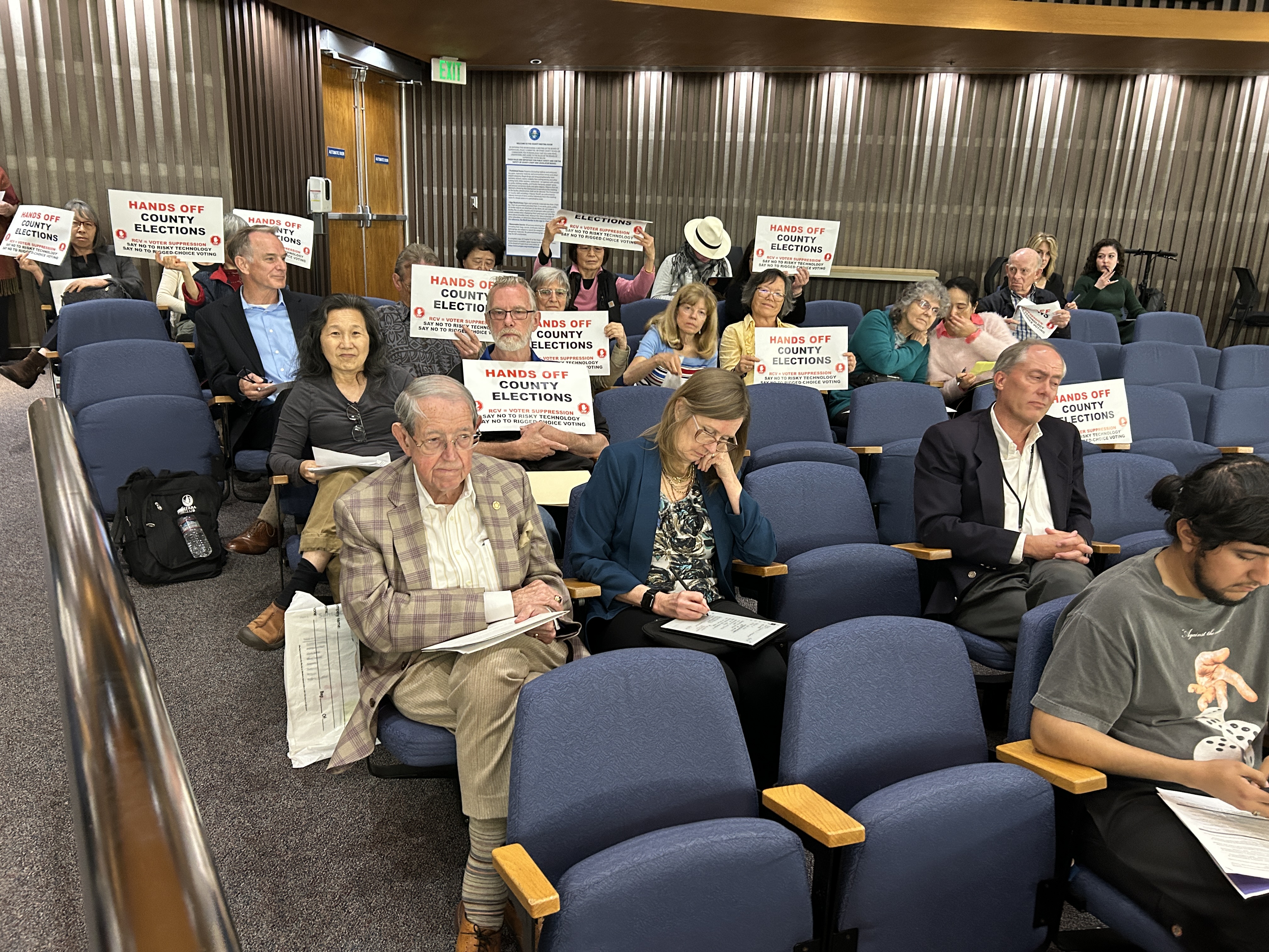 The meeting grew tense at times, prompting Duong to briefly pause proceedings to restore order. Some attendees held signs that read “Hands Off County Elections,” signaling grassroots opposition.