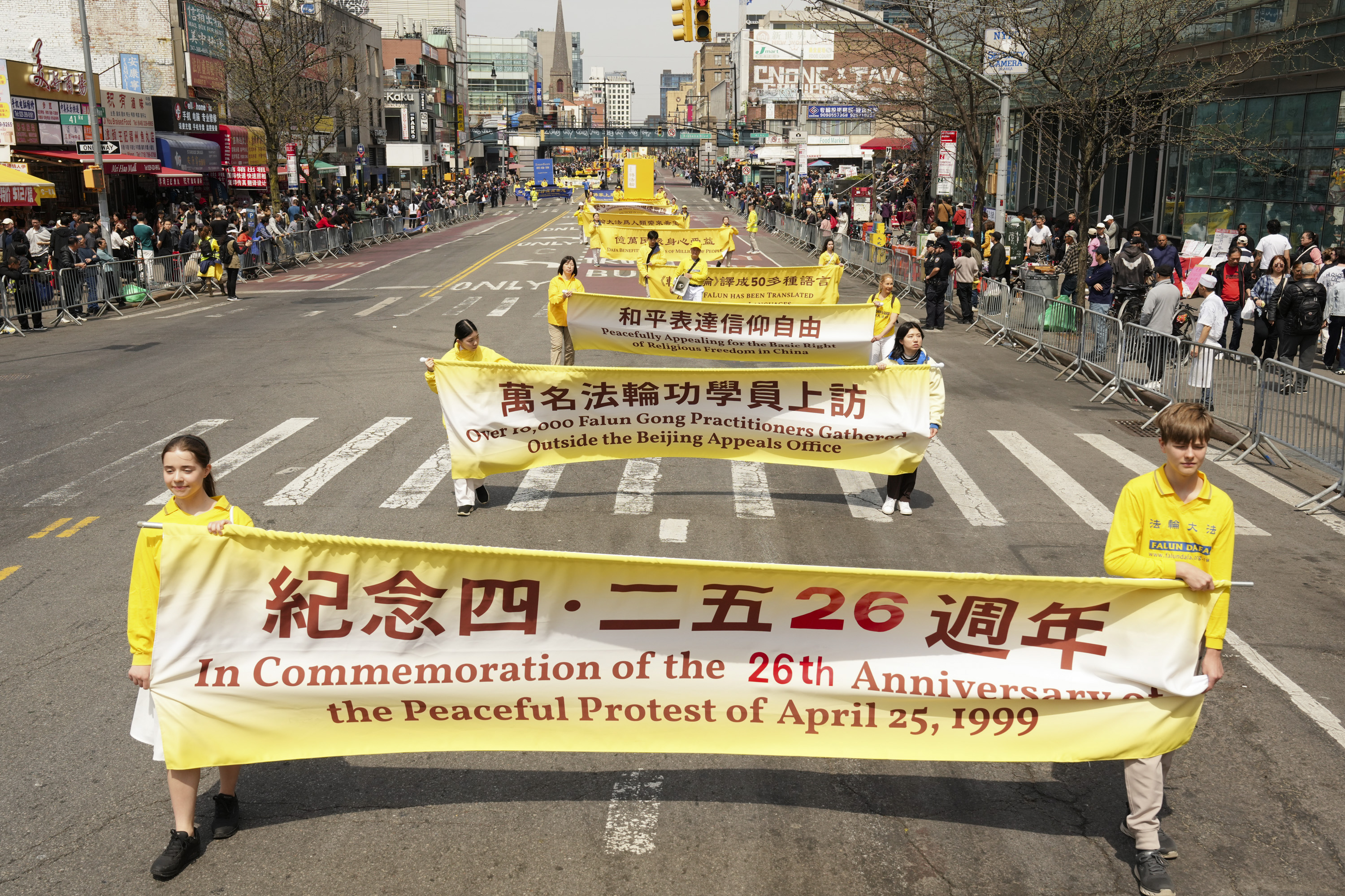 Falun Gong practitioners take part in a parade to commemorate the 26th anniversary of the April 25 appeal, in Flushing, New York, on April 19, 2025. (Larry Dye/The Epoch Times)