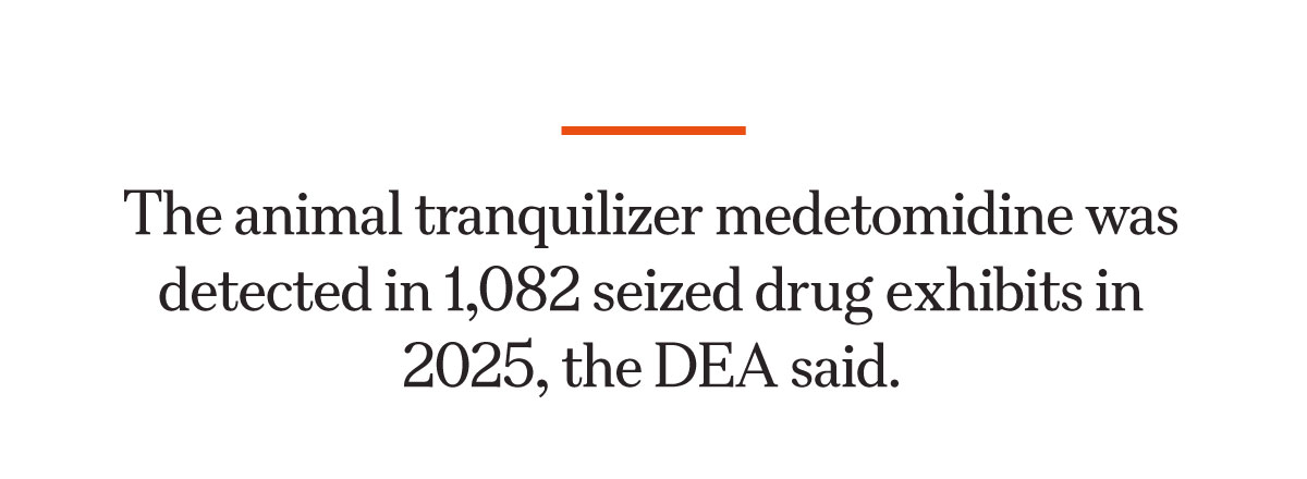 The DEA’s nine labs across the country have seen a sharp increase in medetomidine. The animal tranquilizer was detected in 72 seized drug exhibits in 2024—a figure that increased to 1,082 in 2025, Tarentino said, adding that most of the medetomidine was found mixed with fentanyl.