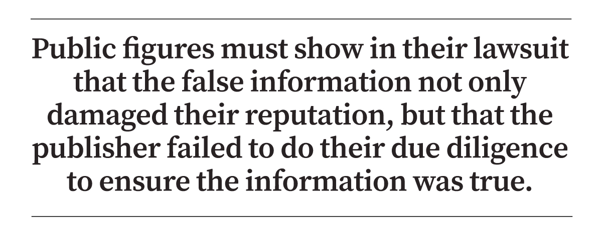 But for public figures, the standard is higher. A public figure, such as a politician, entertainer, or radio show host, is someone who seeks an audience. By drawing attention to themselves, they are inviting scrutiny. Therefore, they must show that the false information not only damaged their reputation but that the publisher failed to do their due diligence to ensure that the information was true.