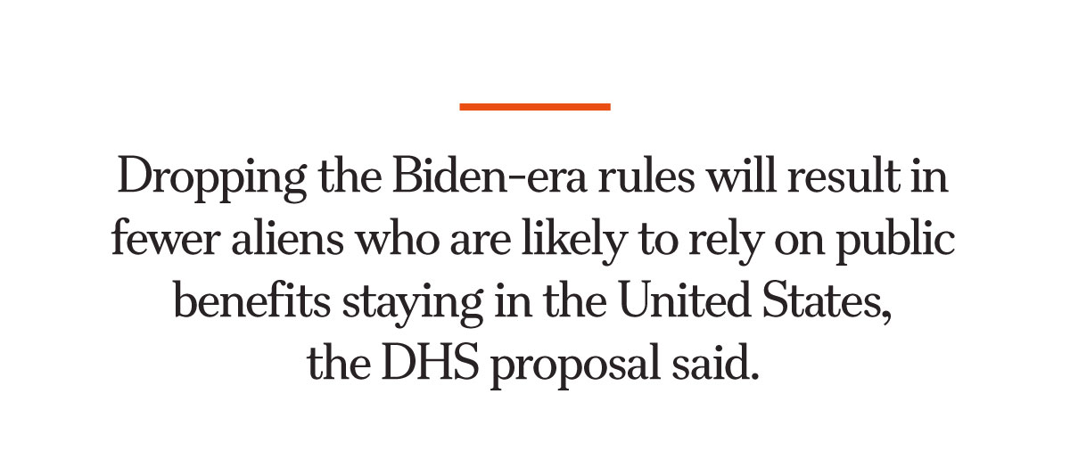 Dropping the Biden-era rules will result in fewer aliens who are likely to rely on public benefits staying in the United States, the DHS proposal said. That matches Congress’s intent in the 1996 welfare law, the agency said.