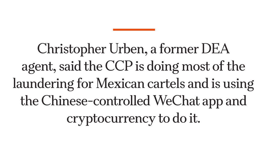 Christopher Urben, a former agent with the Drug Enforcement Administration who now works for global investigations firm Nardello & Co., told the subcommittee the CCP is now doing most of the laundering for Mexican cartels and is using the Chinese-controlled app WeChat and cryptocurrency to do it.
