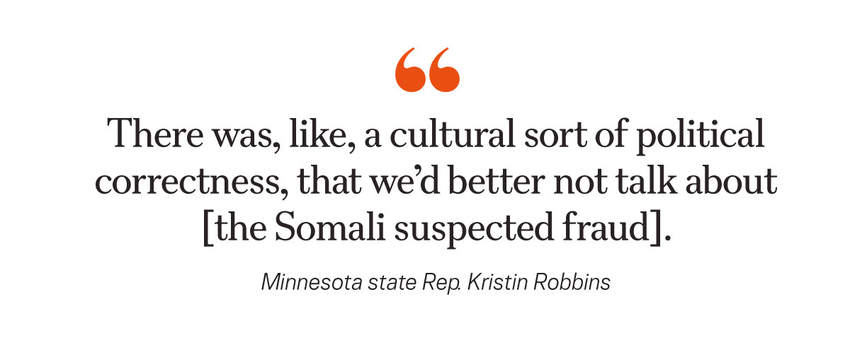 Hudson serves on an anti-fraud committee that is digging for answers. Its chair, state Rep. Kristin Robbins, said she has spoken to multiple whistleblowers “who said they were told not to say anything [about Somalis’ suspected fraud] because that would be ‘racist’ or ‘Islamophobic.’”