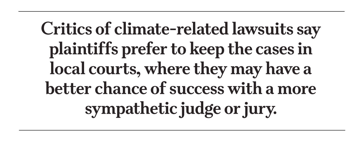 Critics of climate-related lawsuits say plaintiffs prefer to keep the cases in local courts, where they may have a better chance of success with a more sympathetic judge or jury.