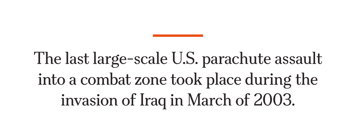The last large-scale U.S. parachute assault into a combat zone took place during the invasion of Iraq in March 2003, when about a thousand paratroopers from the 173rd Airborne Brigade dropped into northern Iraq.