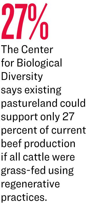 Regenerative grazing also requires 2 1/2 times more land than conventional grazing, according to the Center for Biological Diversity, which argues that there is only enough pastureland in the country to support 27 percent of current production if everyone switched to grass-fed beef and regenerative practices.