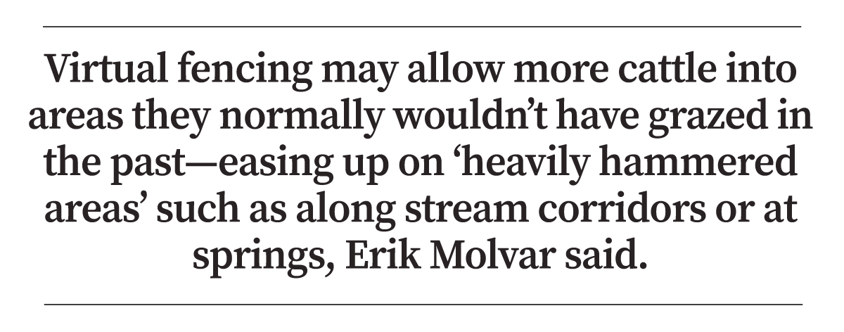 And virtual fencing may allow more cattle into areas in which they normally wouldn’t have grazed in the past—easing up on “heavily hammered areas” such as along stream corridors or at springs.