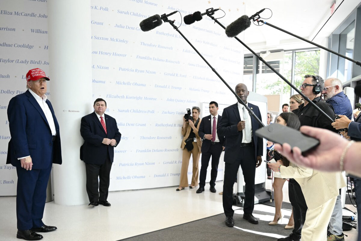 Wearing a “Trump Was Right About Everything!” cap, the president took questions from reporters during a visit to the People’s House exhibit near the White House.
