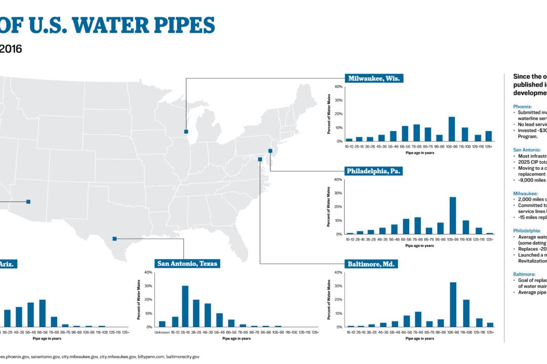 Cities have also expanded replacement efforts. In Baltimore, where pipes average roughly 75 to 80 years old, about 15 miles of mains are replaced or rehabilitated each year.