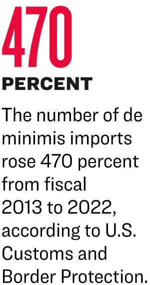 The number of de minimis imports rose by 470 percent between fiscal year 2013 and fiscal year 2022, he said, citing Customs and Border Protection (CBP) data.