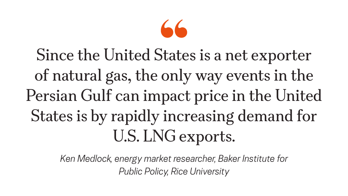 Medlock said, “This may seem counterintuitive, but since the United States is a net exporter of natural gas, the only way events in the Persian Gulf can impact price in the United States is by rapidly increasing demand for U.S. LNG exports.”