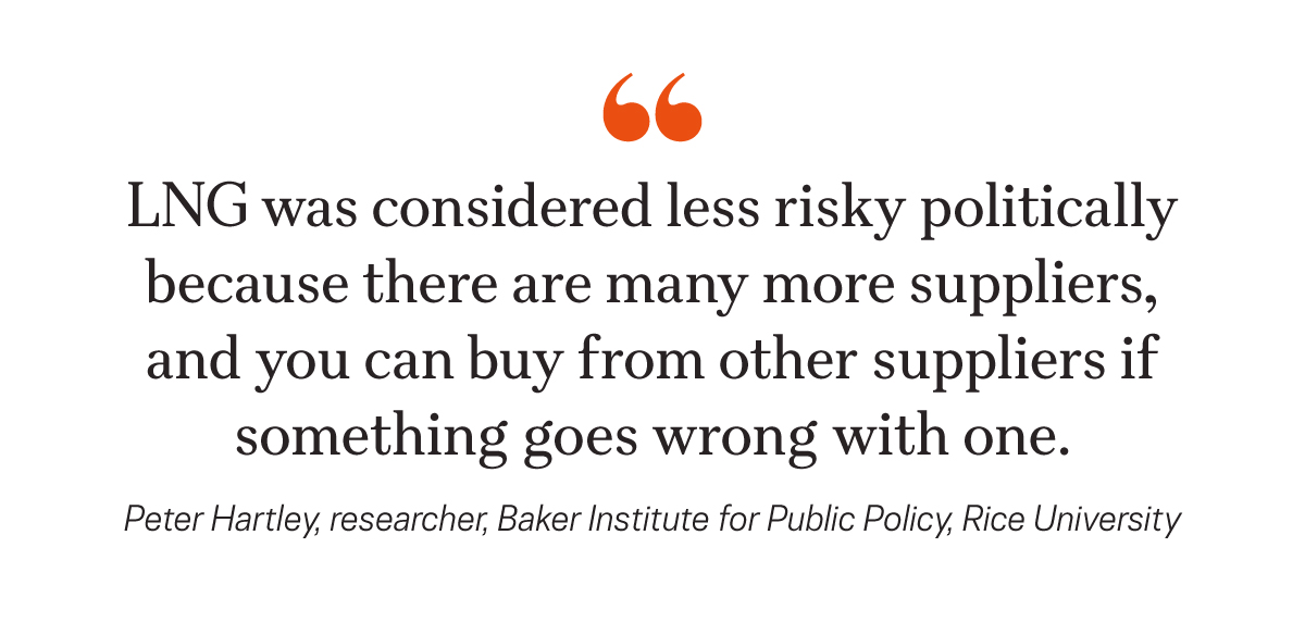 “LNG was considered less risky politically because there are many more suppliers, and you can buy from other suppliers if something goes wrong with one,” said Hartley, who has toured Qatar’s LNG operations.