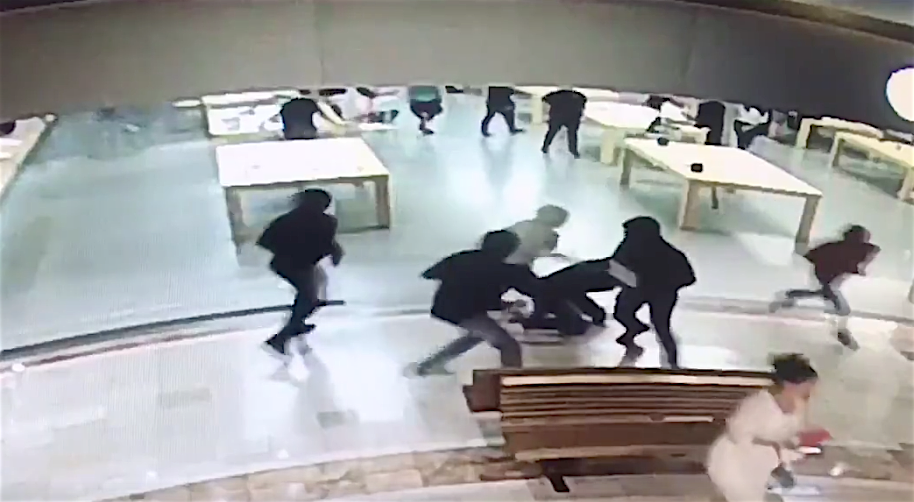 The snatch-and-grab suspects went to a Costa Mesa Apple store in Southern California and took products worth $29,000. An off-duty officer was punched and kicked when he tried to stop them.