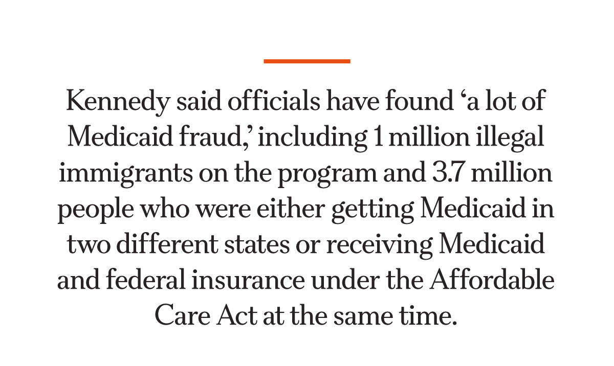 Kennedy said officials have found “a lot of Medicaid fraud,” including 1 million illegal immigrants on the program and 3.7 million people who were either getting Medicaid in two different states or receiving Medicaid and federal insurance under the Affordable Care Act at the same time.