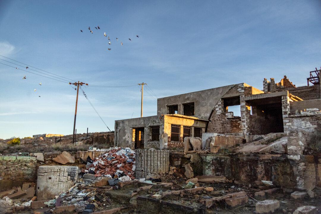 Buildings that once housed mining personnel now sit abandoned near the village of Keramos, Greece, on Nov. 14, 2025. The mines here operated in the late 1800s and early 1900s, with another brief revival in the mid-20th century funded by the Marshall Plan. (John Fredricks/The Epoch Times)