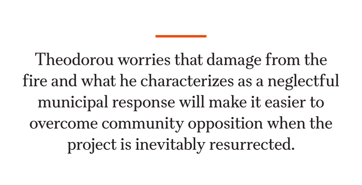 Now, Theodorou worries, damage from the fire and what he characterizes as a neglectful municipal response—“the planes didn’t come, the firemen did nothing”—will make it easier to overcome community opposition when the project is inevitably resurrected.