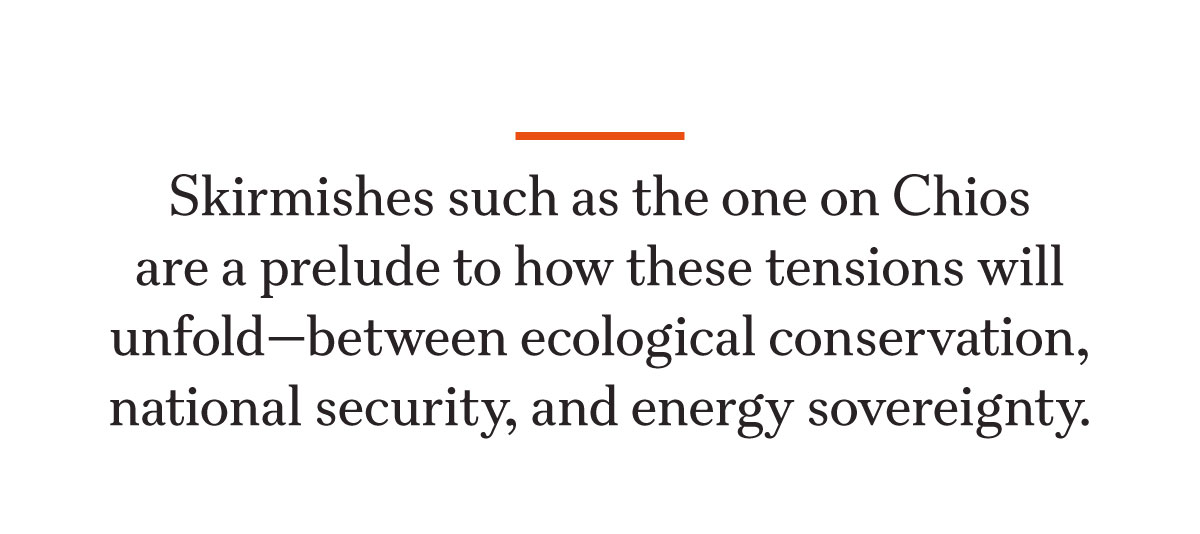 Europe’s drive for supply stability is only just beginning. Skirmishes such as the one on Chios are a prelude to how these tensions will unfold—between ecological conservation, national security and energy sovereignty.
