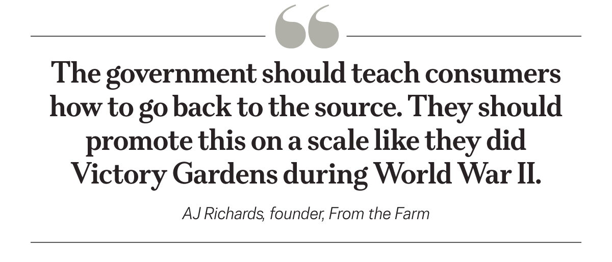 “The government should teach consumers how to go back to the source; they should promote this on a scale like they did victory gardens during World War II,” he said of the iconic USDA-backed campaign urging Americans to use their properties to produce food.