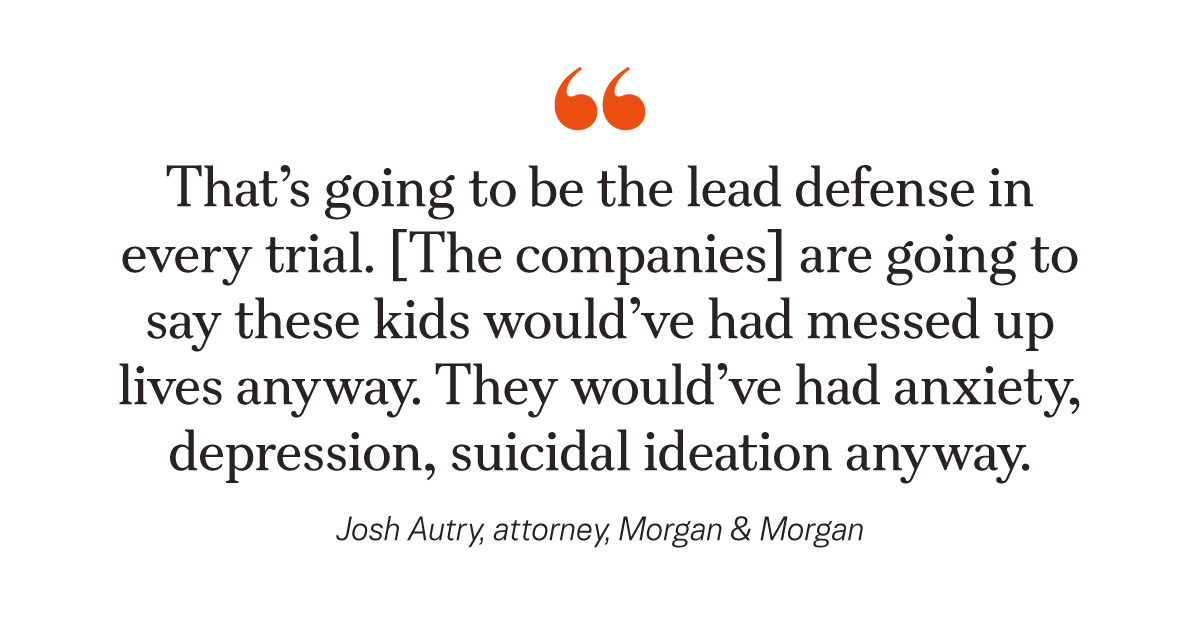 “I think that’s going to be the lead defense in every trial,” he said. “They are going to say these kids would’ve had messed up lives anyway, [that] they would’ve had anxiety, depression, suicidal ideation anyway.”