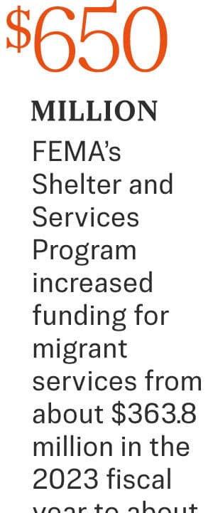 Federal Emergency Management Agency funds were also allocated to San Diego County for migrant services and to nongovernmental agencies such as the Catholic Charities Diocese of San Diego and Jewish Family Services. The agency’s Shelter and Services Program increased funding from about $363.8 million in the 2023 fiscal year to about $650 million in fiscal 2024.