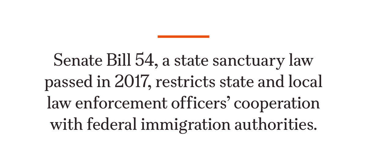 Senate Bill 54, a state sanctuary law passed in 2017, restricts state and local law enforcement officers’ cooperation with federal immigration authorities, including Immigration and Customs Enforcement (ICE), and prohibits police from asking about immigration status, holding individuals for ICE, or transferring them to ICE.