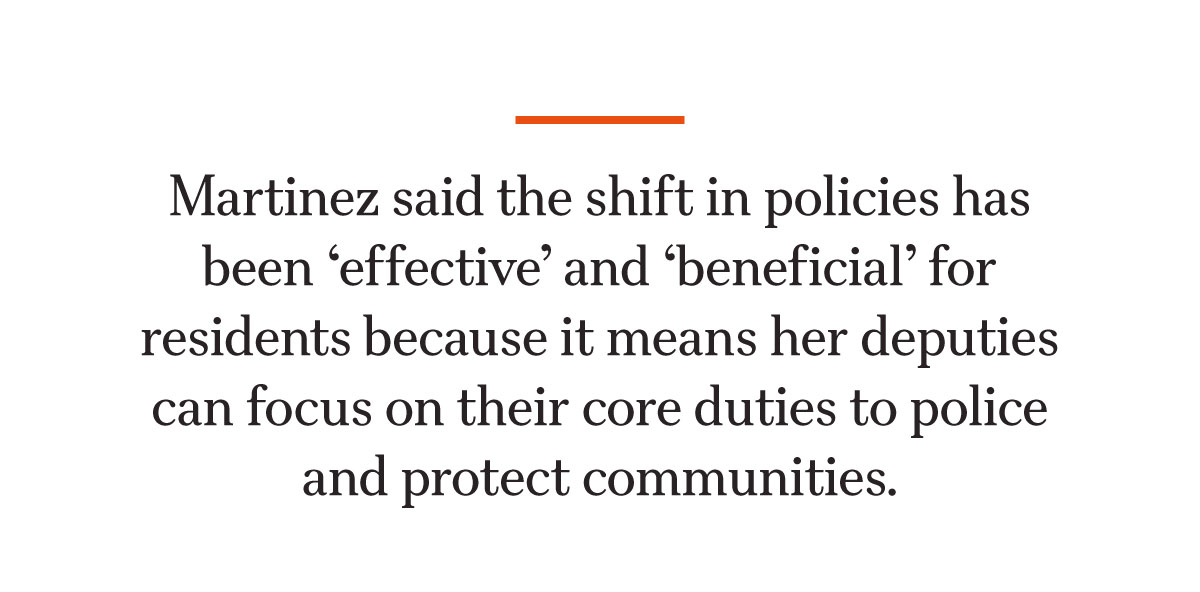 The shift in policies has been “effective” and “beneficial” for residents because it means that her deputies can focus on their core duties to police and protect communities and address other threats, such as drug and human trafficking.