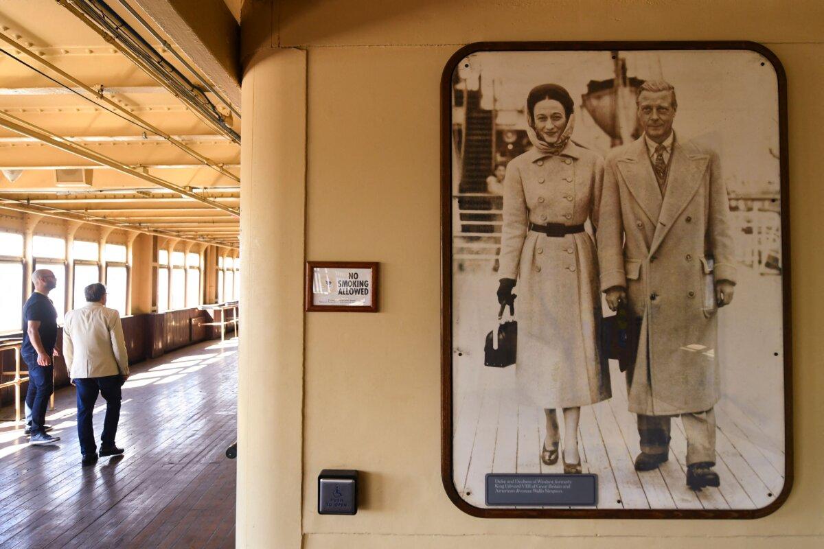 A photograph is displayed of the Duke and Duchess of Windsor, formerly King Edward VIII of Great Britain and Wallis Simpson, on the Queen Mary historic ocean liner in Long Beach, Calif., on Feb. 18, 2022. (Patrick T. Fallon/AFP via Getty Images)