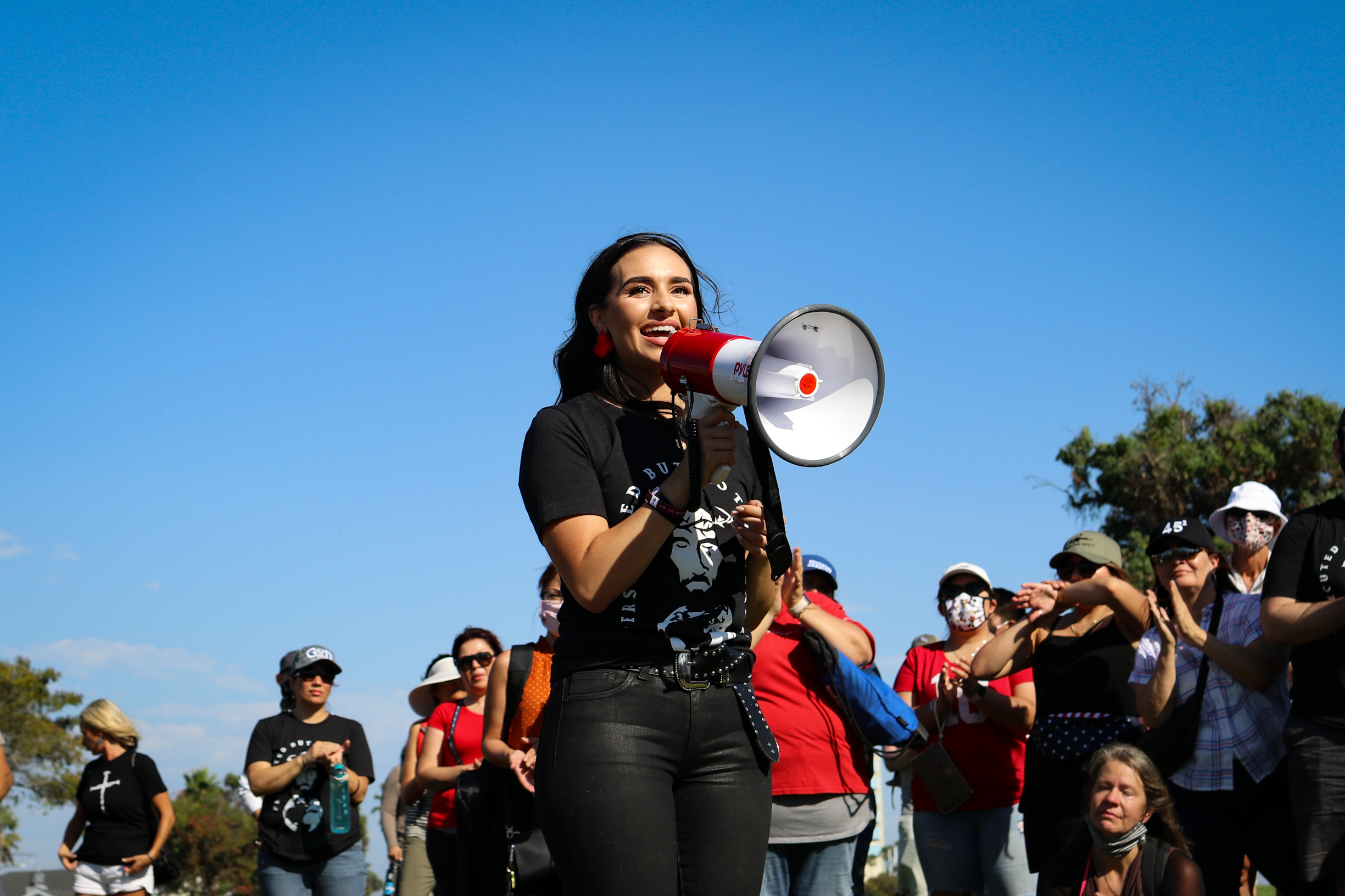 Gia Chacon speaks to a crowd gathered by her organization, For the Martyrs, to raise awareness about persecuted Christians worldwide, in Long Beach, Calif., on Sept. 5, 2020. (Jamie Joseph/The Epoch Times)