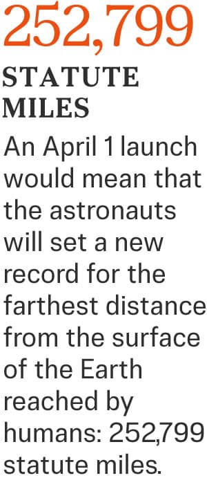 The successful April 1 launch means that Wiseman, Glover, Koch, and Hansen will set a new record for the farthest distance from the surface of the Earth reached by humans: 252,799 miles. That is 4,144 miles farther than the previous record set by Apollo 13 in 1970.