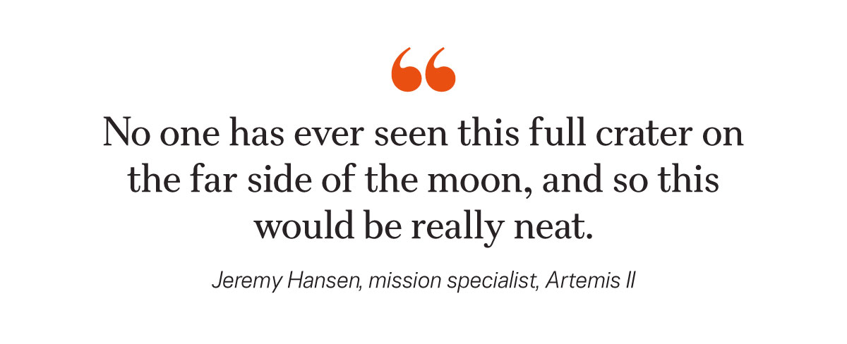 “No one has ever seen this full crater on the far side of the moon, and so this would be really neat,” Hansen said. “I’m excited to have a look at it. It’s just enormous, super complex, and you could stare at it probably for hours.”
