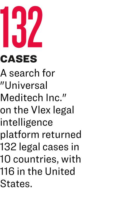 A search for “Universal Meditech Inc.” returned 132 legal cases in 10 countries—116 in the United States—while “Prestige Biotech” returned 53 cases in four countries, of which 31 are in the United States.