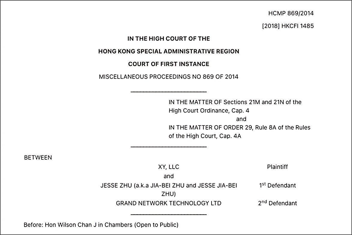 An example of a page from court documents on the case among XY, Mr. Zhu, and Grand Network Technology. (Vlex)