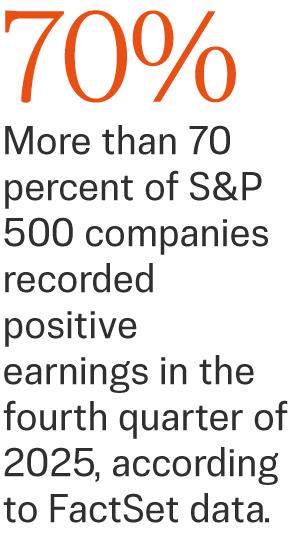 Recently, S&P 500 companies have reported earnings that beat market expectations. More than 70 percent of companies recorded positive earnings surprises in the fourth quarter of 2025, according to FactSet data.