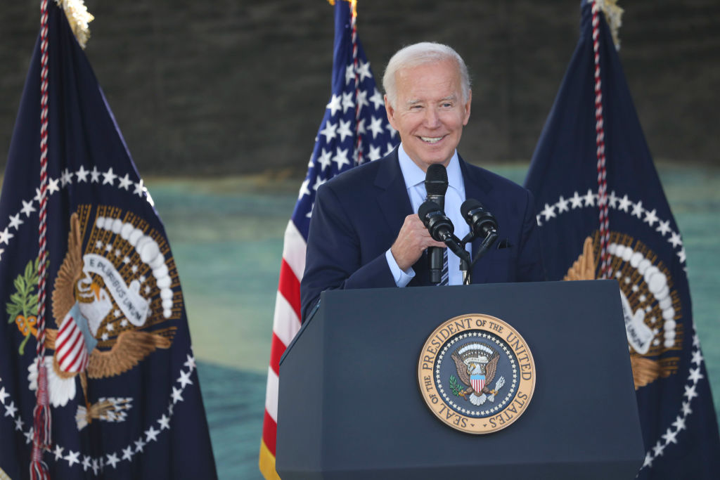 U.S. President Joe Biden speaks with dignitaries and employees at ViaSat in Carlsbad, Calif., on Nov. 4, 2022. (Sandy Huffaker/Getty Images)